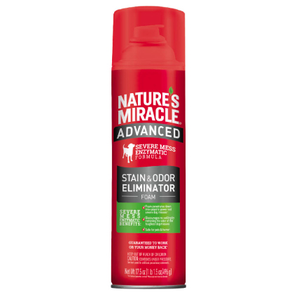 El eliminador de manchas y olores fórmula avanzada para perros de Nature’s Miracle® es una fórmula con microorganismos que eliminan las manchas y olores más difíciles ocasionadas por los perros. Nuestra fórmula produce enzimas cuando entra en contacto con los desechos de origen biológicos, como la orina, heces, vómito y sangre de los perros. La fórmula enzimática continuará funcionando mientras los desechos estén presentes, removiendo las moléculas que causan las manchas y los malos olores.