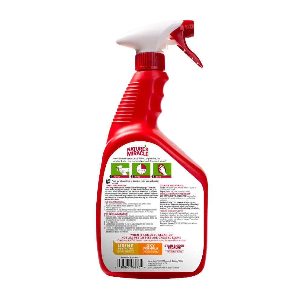 Utilice el producto sin diluir. Eliminación de manchas: 1. Limpie la mayor cantidad de manchas posible, luego empape bien la mancha. 2. Deje actuar durante 15 minutos. 3. Seque la mancha con un paño limpio. Deje que el área se seque durante 24 horas *. Eliminación de olores: 1. Limpie el exceso de material que causa olores, luego remoje completamente el área **. 2. Deje el área tratada húmeda y que se seque con el aire. El olor se desvanecerá a medida que el producto se seque. 3. No limpie el exceso *. * Para manchas severas, viejas o difíciles en alfombras o telas, siga los pasos 1-2 frotando suavemente la mancha con un cepillo de cerdas suaves durante 1 minuto, luego deje secar durante 24 horas. ** La saturación es importante para que este producto pueda penetrar profundamente en la fuente del olor.